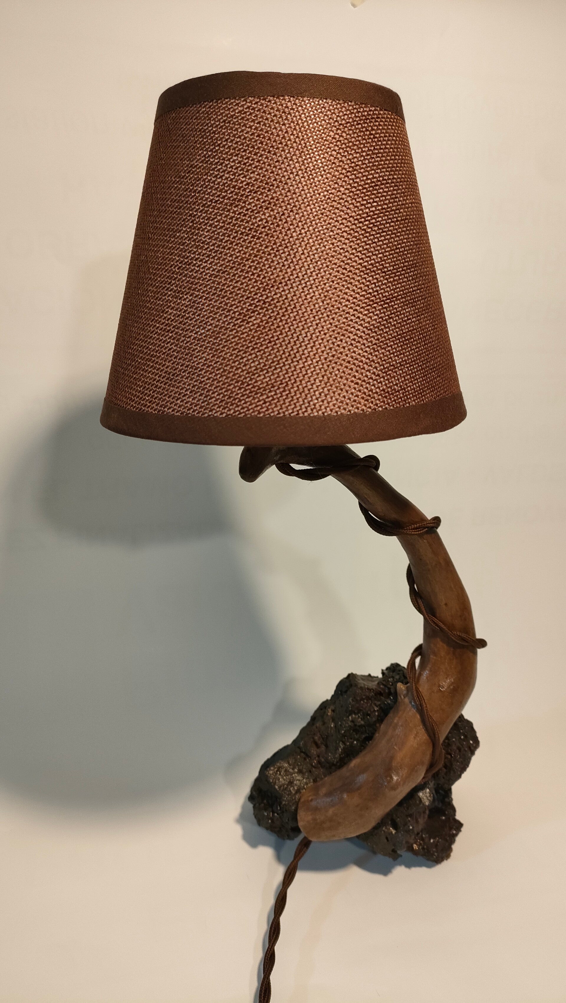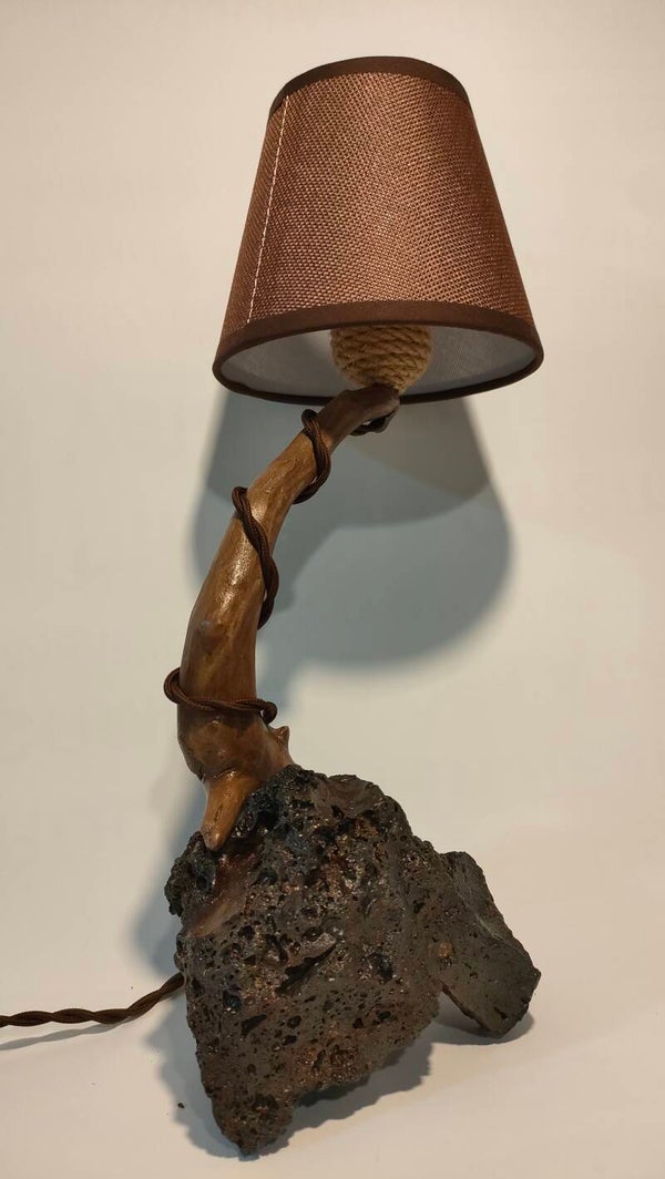 Realizada completamente a mano a partir de una rama natural, posada sobre una roca de fundición. Con tulipa y casquillo forrado en cuerda, para bombillas E27 (no incluida) y cable rústico enroscado.
