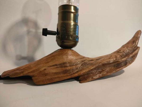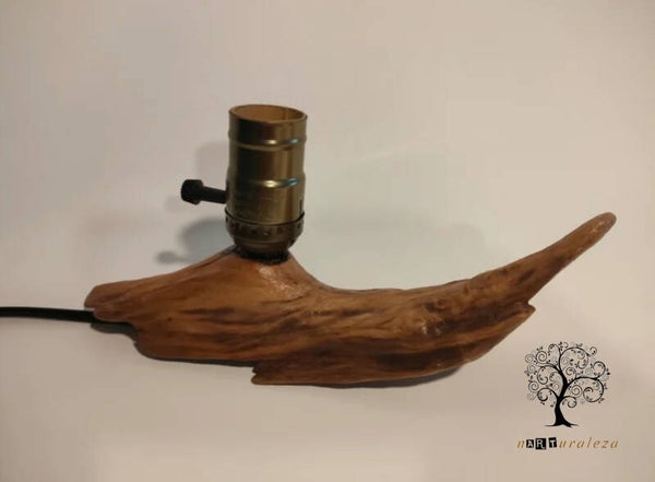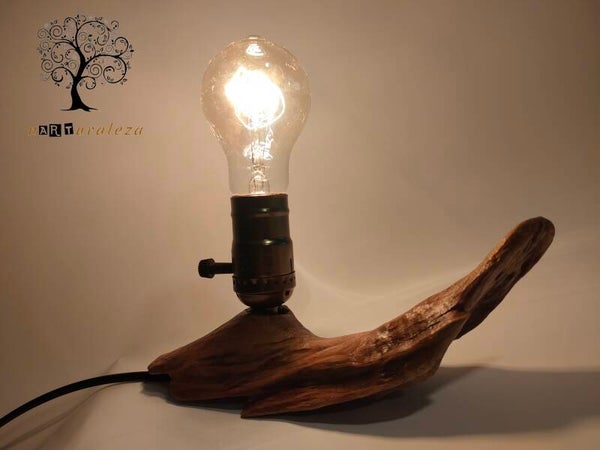 Original y única lampara artesanal. Realizada completamente a mano a partir de un fragmento de tronco barnizado y tratado. Casquillo/interruptor rustico de color cobre para bombillas tipo E-27 (no incluida).