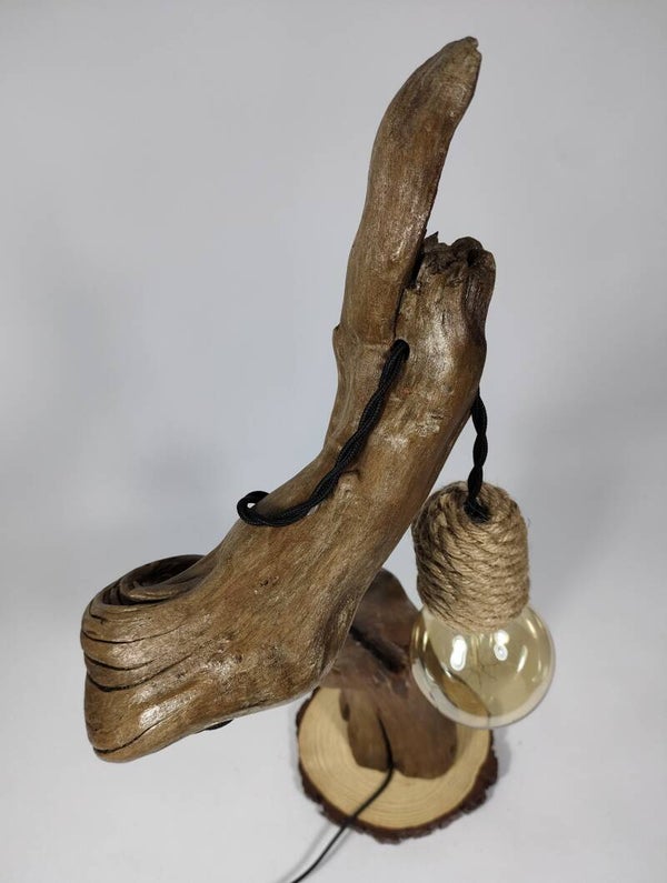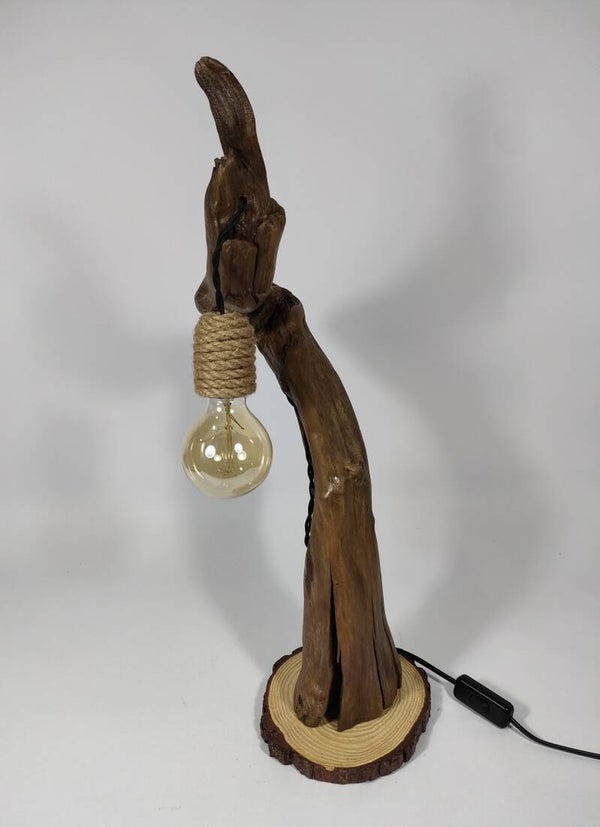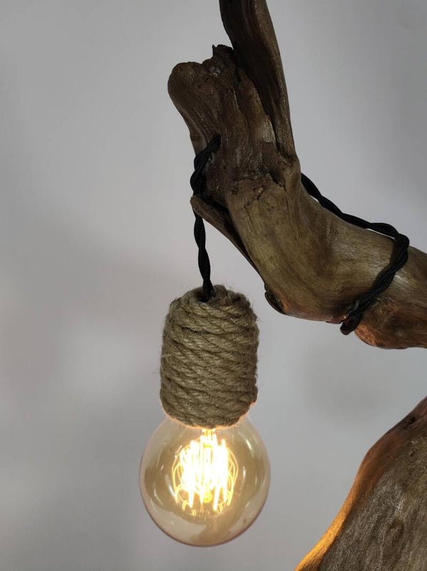 Preciosa y original lampara de mesa, realizada completamente a mano a partir de un tronco natural curvado. Con casquillo E27, forrado de cuerda y cable trenzado visto.
