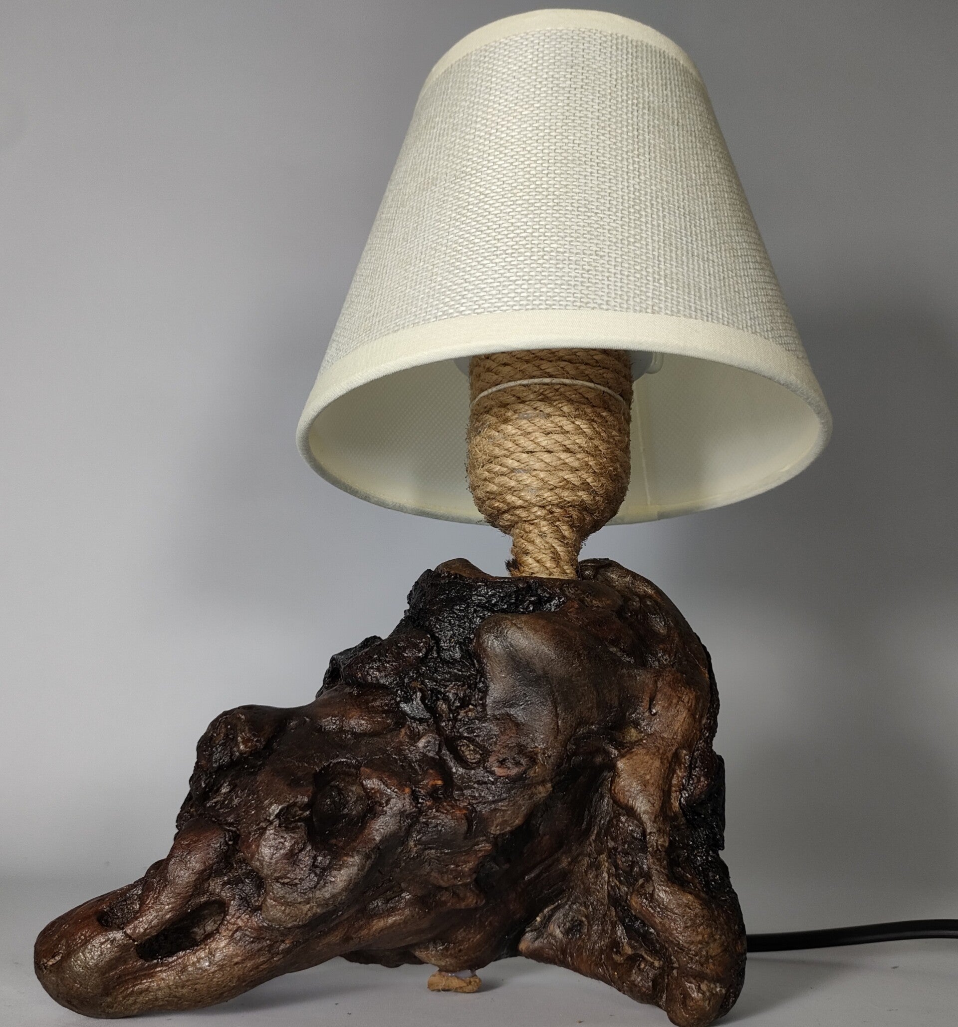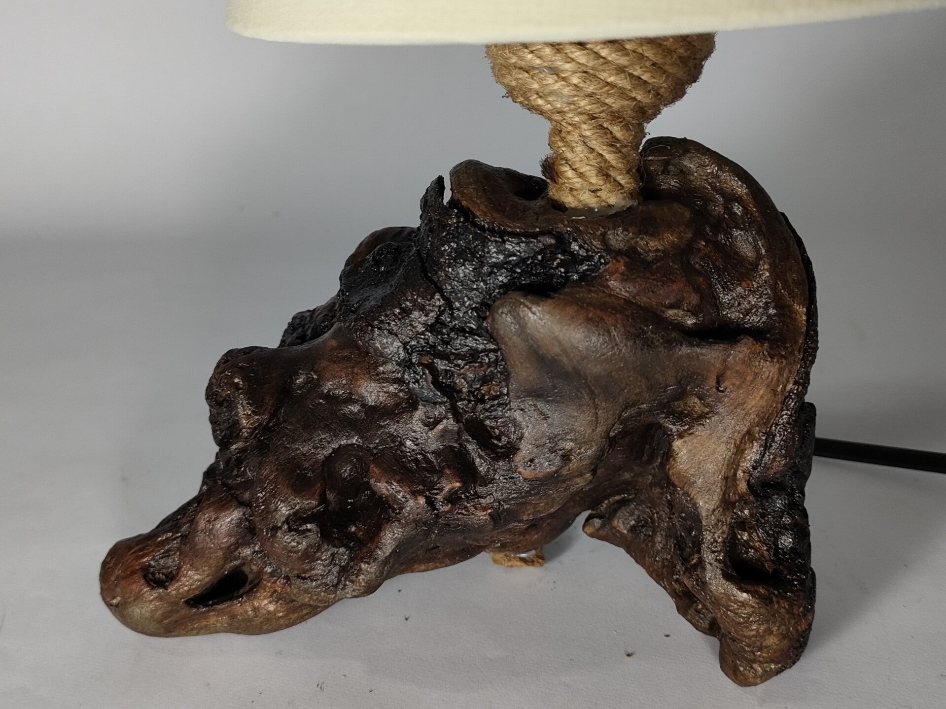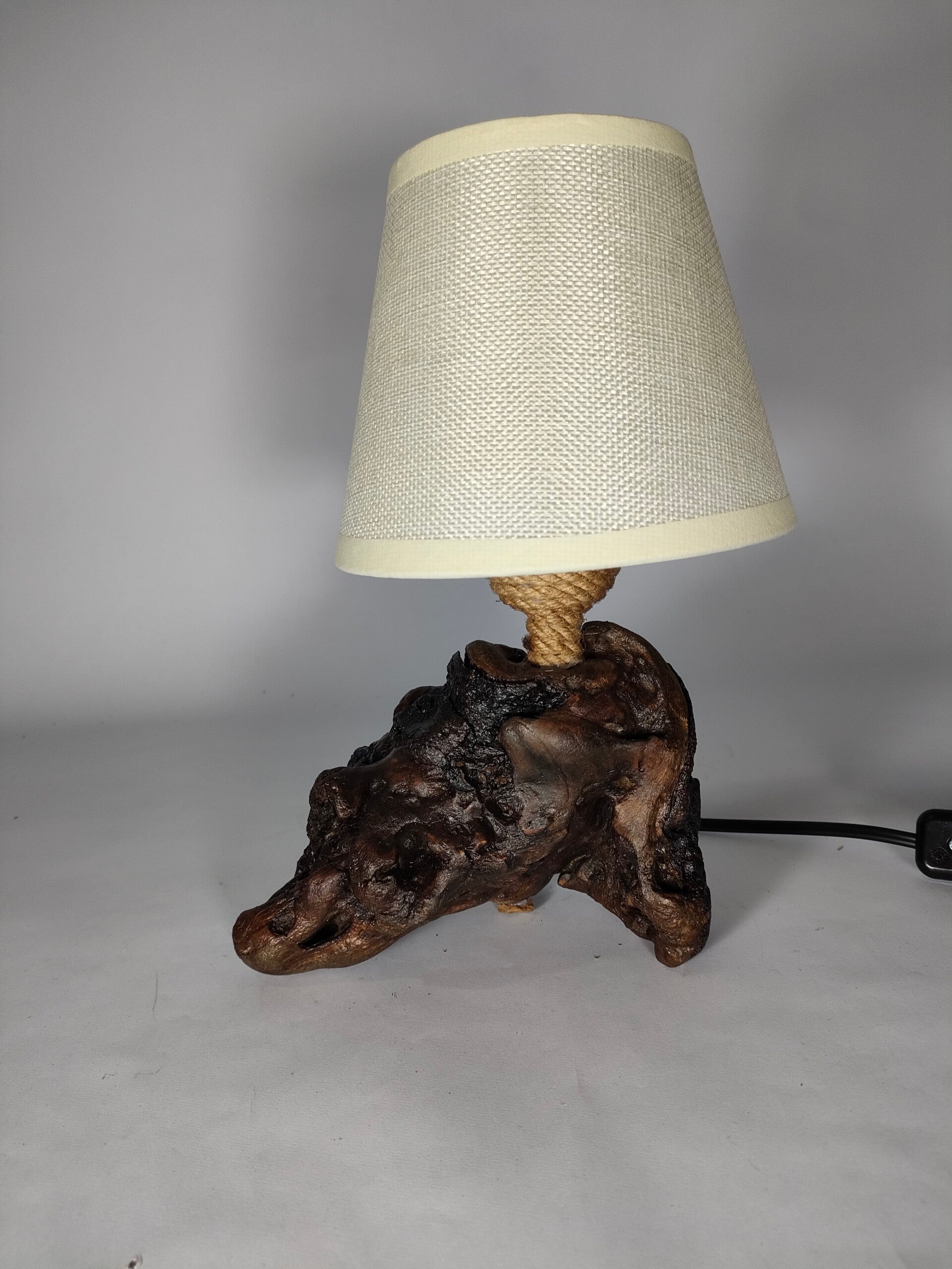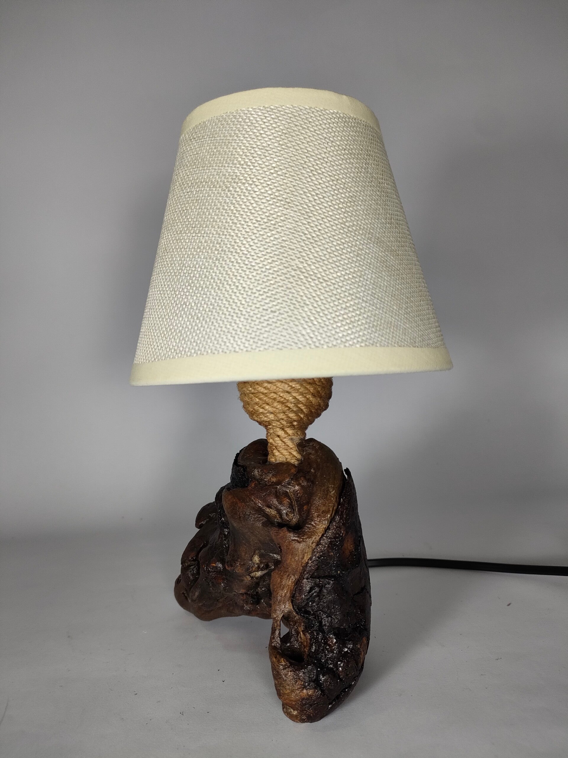 Original y "coqueta" lámpara de mesa. Realizada a partir de un tronco natural. Tratado y tintado. Con tulipa y castillo forrado en cuerda para bombillas de tipo E-27 (no incluida).