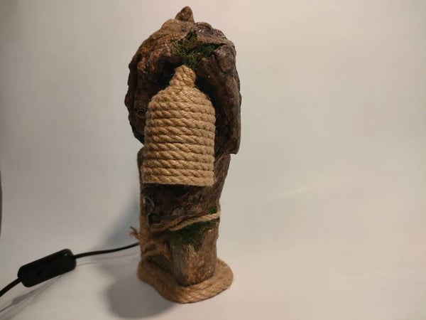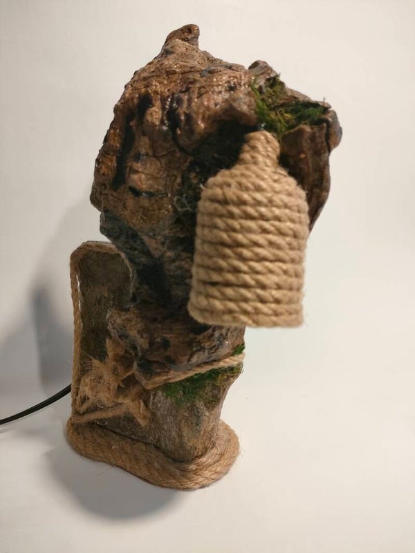 Curiosa lampara de mesa, con un diseño diferente y llamativo. Realizada completamente a mano; compuesta de madera y piedra, con adornos en cuerda. Y casquillo colgante, forrado en cuerda para bombillas tipo E27. (no incluye bombillas).