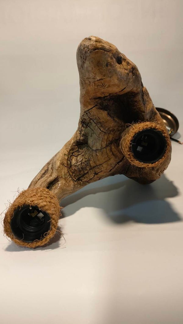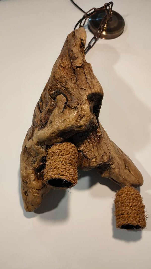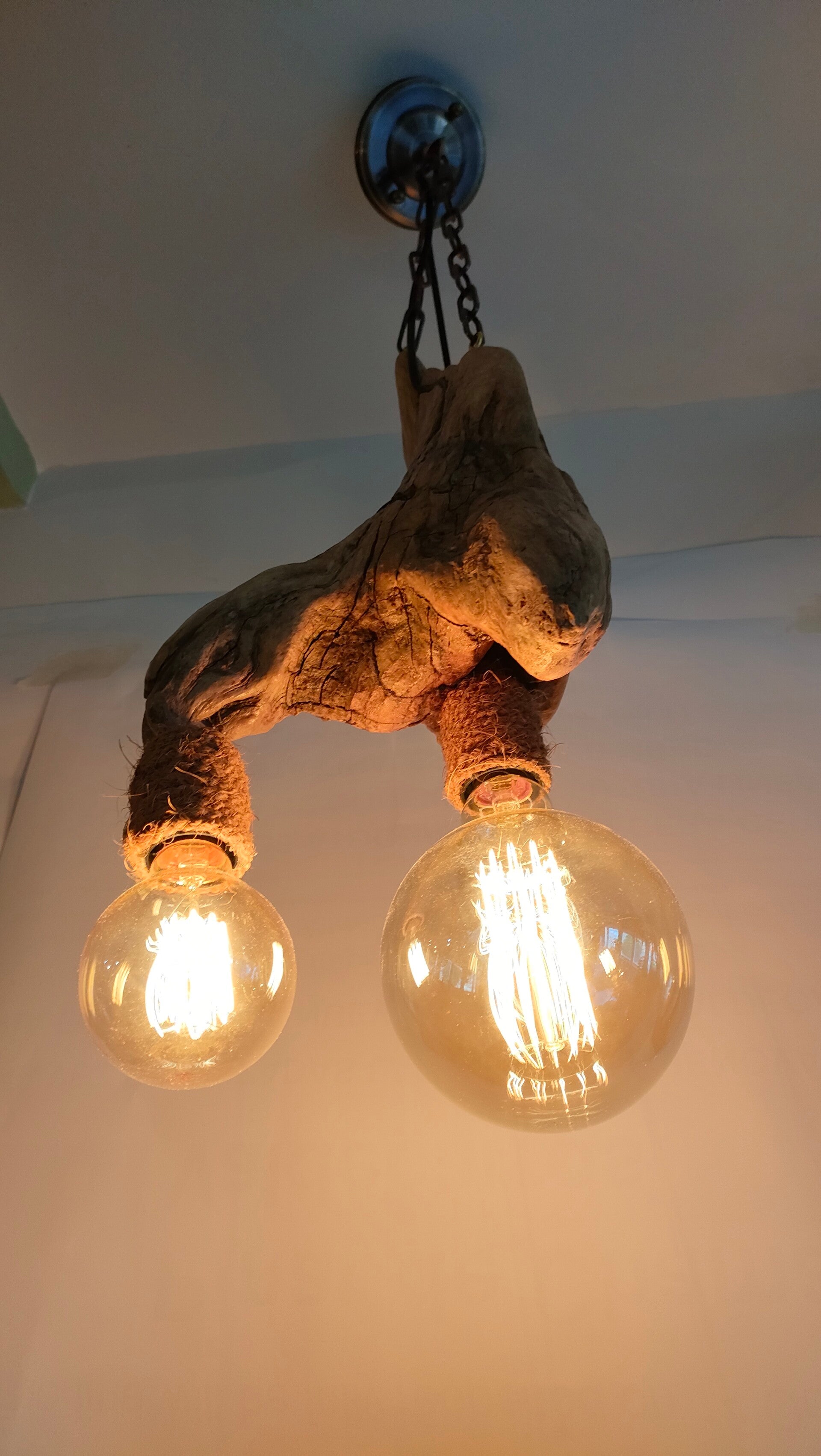 Lámpara de techo artesanal. Realizada completamente a mano, a partir de un tronco natural.