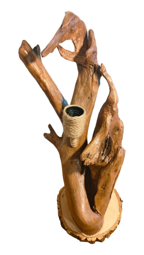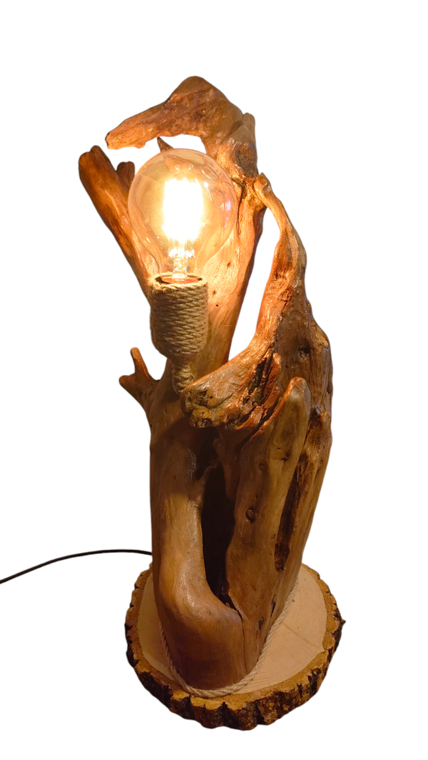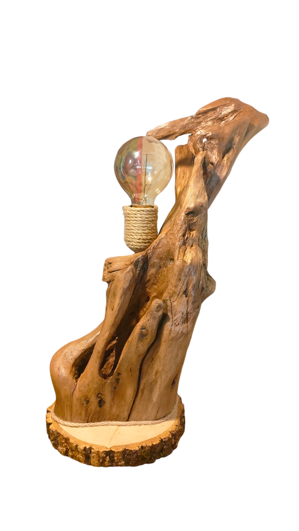 Preciosa y original lámpara de mesa artesanal, realizada en madera natural.