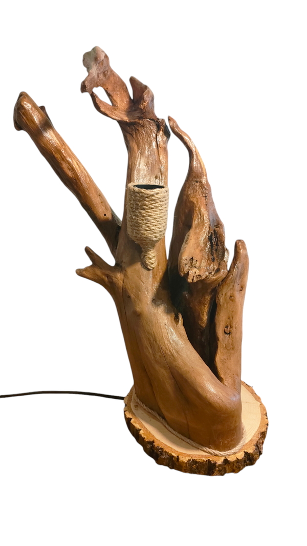 Rama natural, tratada y barnizada, sobre una base de madera de cedro. Que cuenta de punto de luz, con casquillos forrado en cuerda, acoplado en la propia madera.
