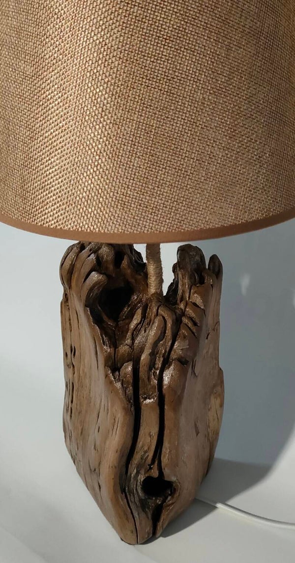 Lámpara de mesa, realizada completamente a mano a partir de un tronco natural. Consta de una base de troncos en madera (tratada y barnizada en brillo) a la que se le ha insertado un punto de luz, con casquillo (E-27) forrado en cuerda (al igual que la varilla de sujeción), dentro de una tulipa de tela.