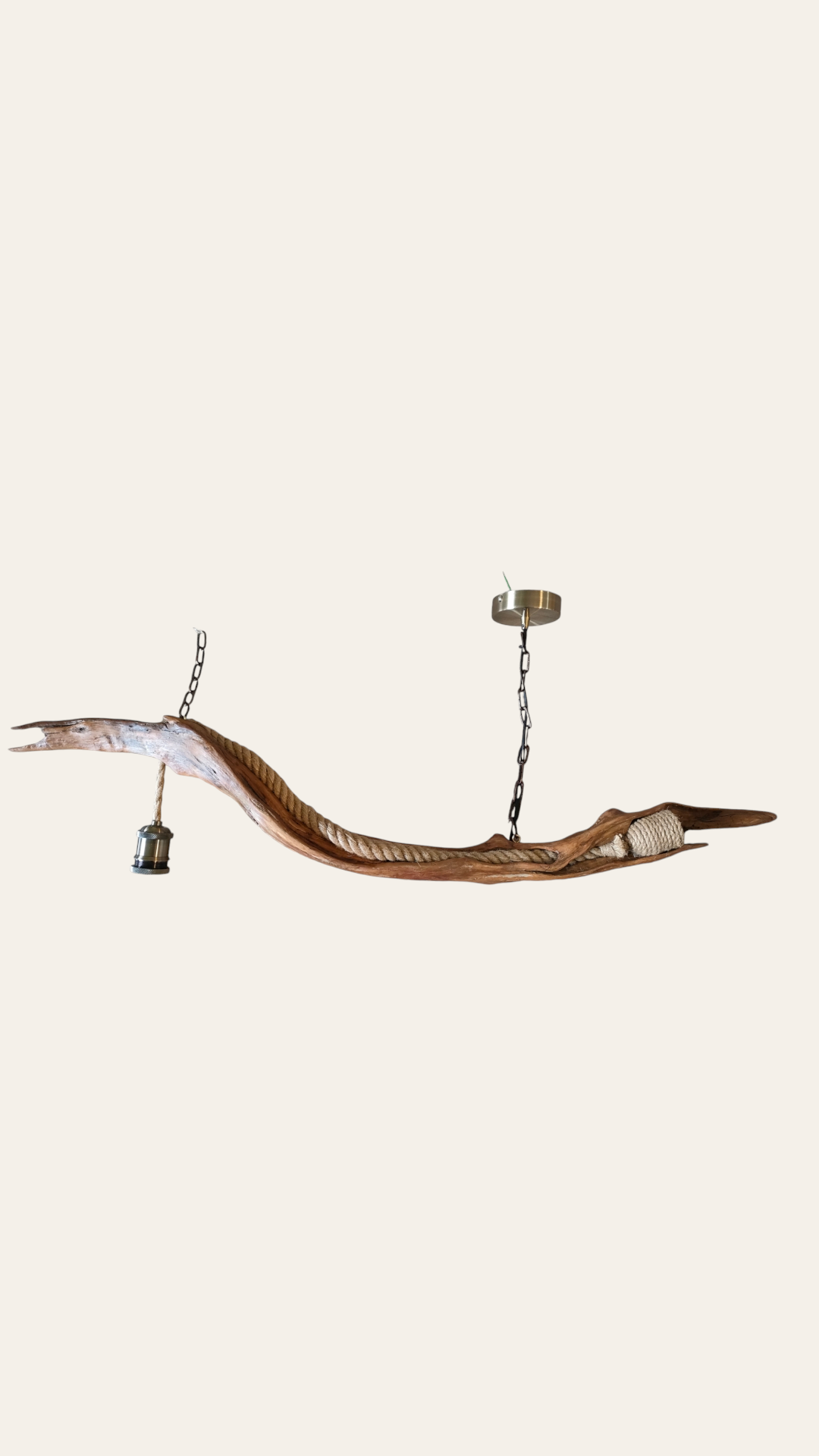 Lámpara de techo. Realiza de forma completamente artesanal, a partir de un tronco natural. Ahuecado éste para albercar una cuerda donde va insertado el cable de alimentación para dos puntos de luz de bombillas E27. Con casquillo rustico, uno; y forrado en cuerda, otro.
