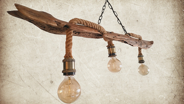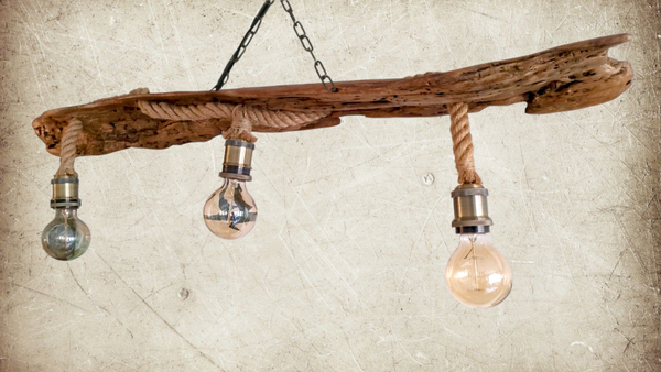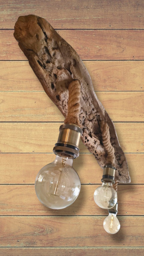 Lámpara de techo artesanal. Realizada a partir de un tronco de madera natural. Donde se han instalado 3 puntos de luz, con el cable camuflado en cuerda y casquillos E-27, tipo rústico.