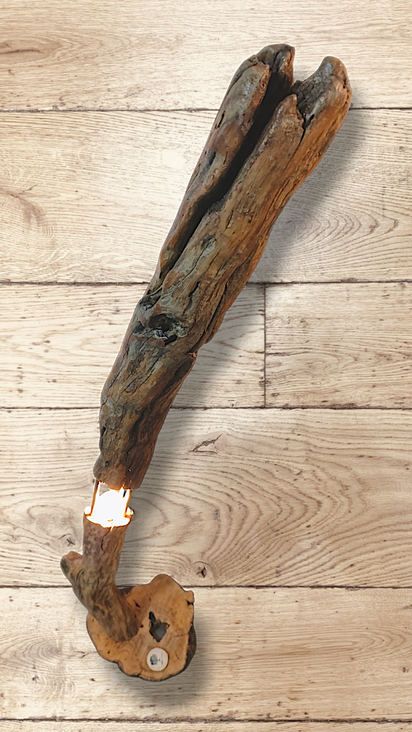 Original y única lámpara de pie. Realizada completamente a mano, de forma artesanal, a partir de madera natural. Tratada y barnizada. Consta de un punto de luz, para bombillas E-14; que ha sido insertado y embutido dentro del tronco. Separando ambos fragmentos y únicos ambos con barillas de hierro de ferralla.