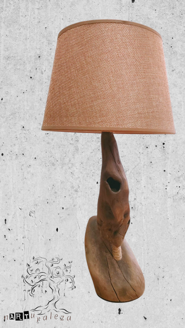 Lámpara de mesa, realizada a partir de dos fragmentos de manera; únicas por medio de varilla hueca se aluminio. Consta se un punto de luz con casquillo parcialmente forrado en cuerda y soporte para tulipa.