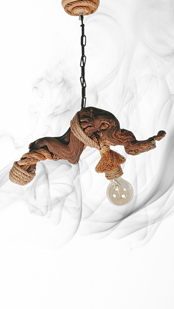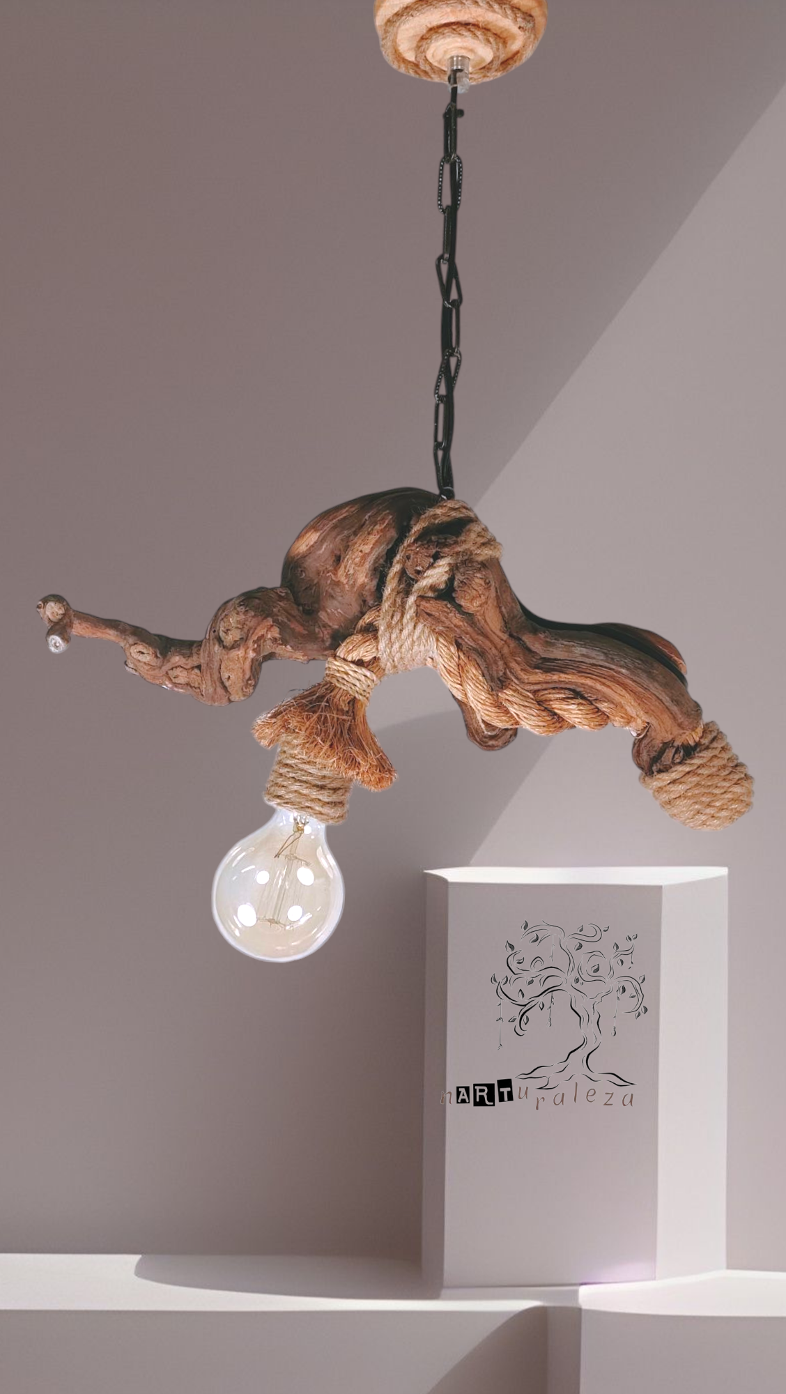 Lámpara de techo. Realizada de manera artesanal a partir de madera de parra y cuerda.