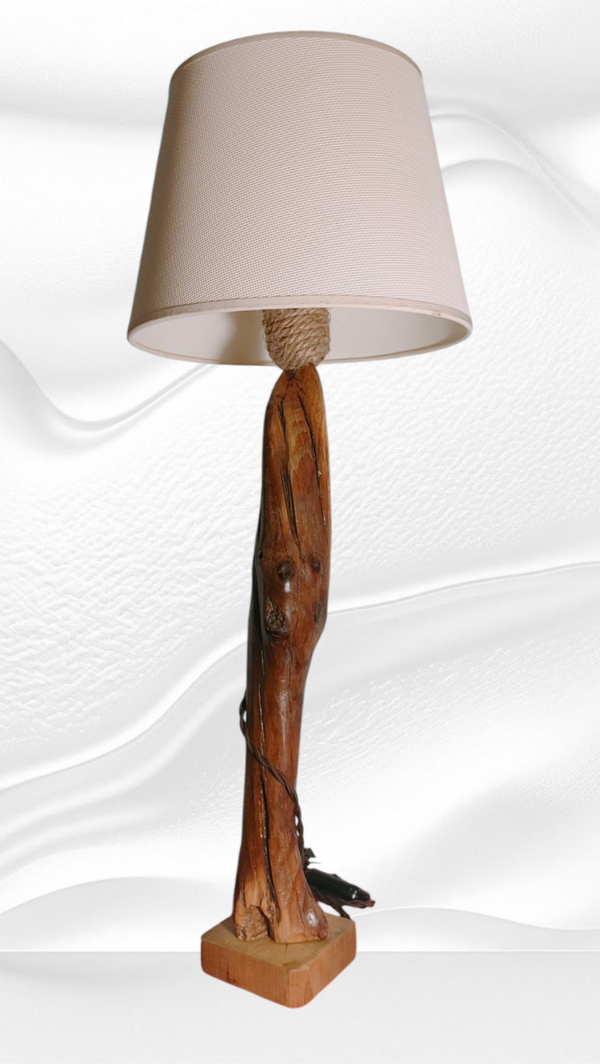 Lámpara de mesa artesanal de 66 cm de alto. Realizada a partir de un tronco de madera natural.Con cable rústico visto y tulipa de tela. Y casquillo para bombillas E-27, forrado en cuerda.
