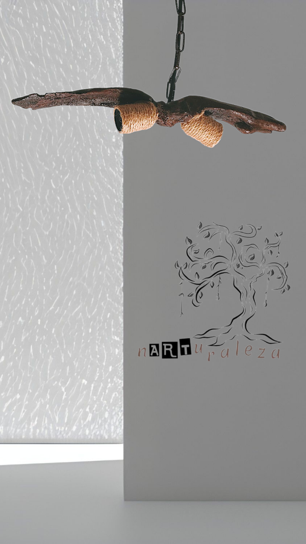 Lámpara de techo. Realizada artesanalmente a partir de un fragmento de madera de deriva. Consta de dos puntos de luz, para bombillas E-27. Con casquillos forrados en cuerda.