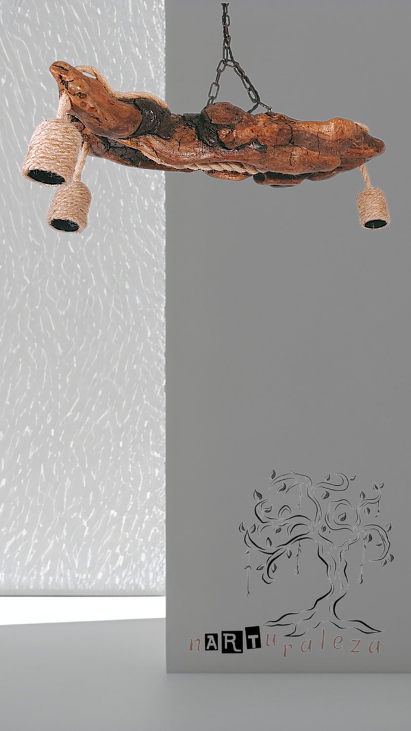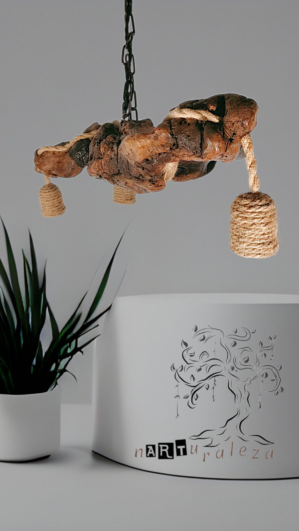 Lámpara de techo artesanal. Realizada a partir de un tronco natural irregular y cuerda.