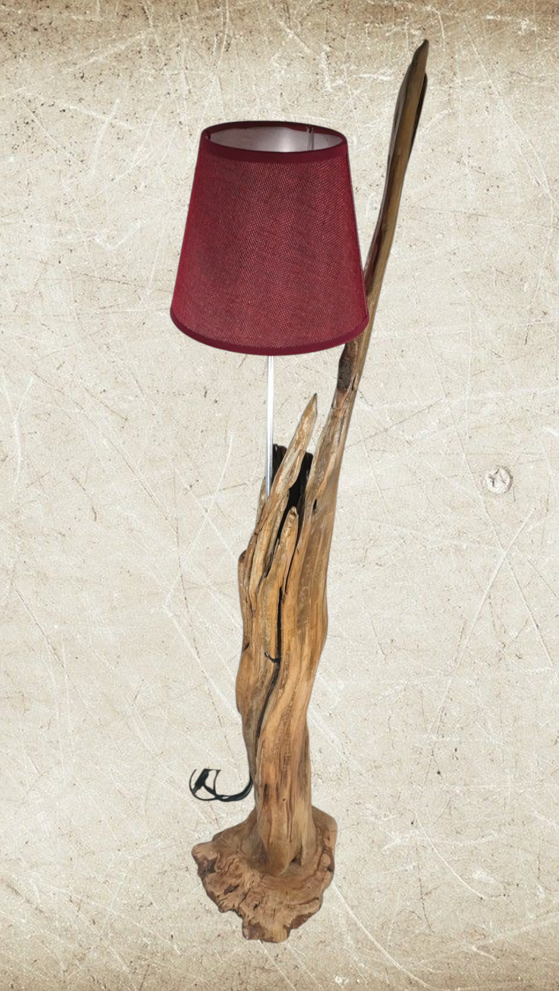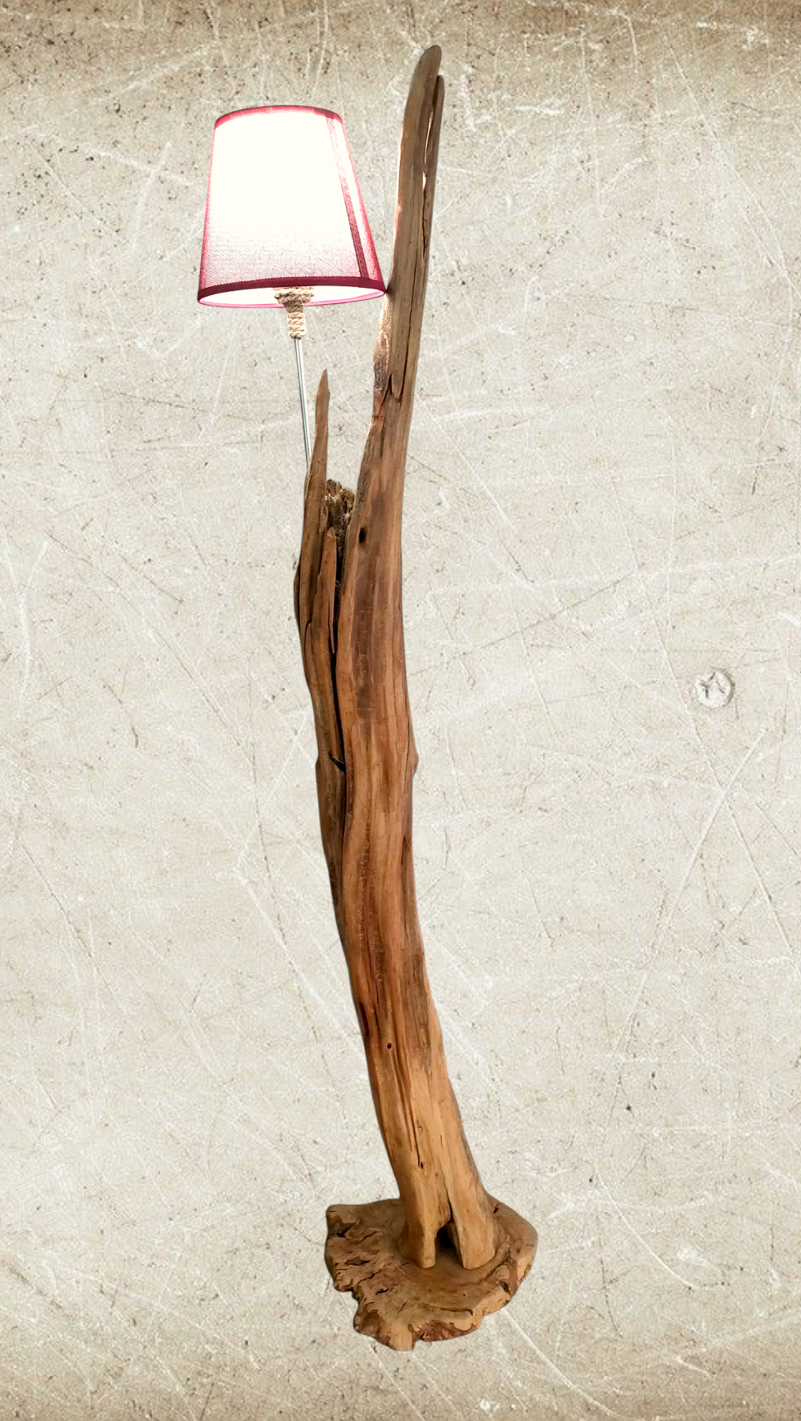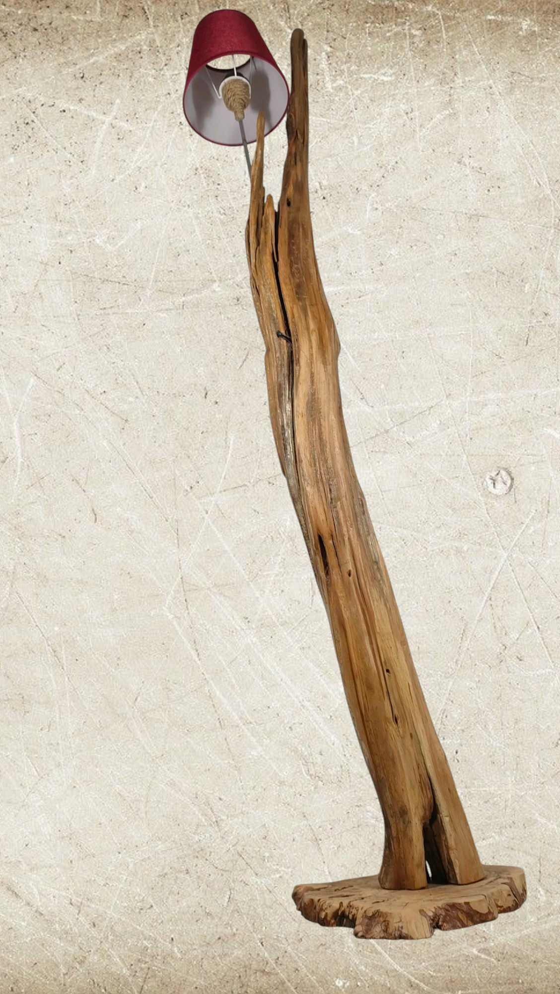 Cuenta con un punto de luz para bombillas E-27, soportado por una varilla de aluminio que esta insertada en la propia madera y casquillo forrado, parcialmente, en cuerda. Pantalla en color granate de 22cm