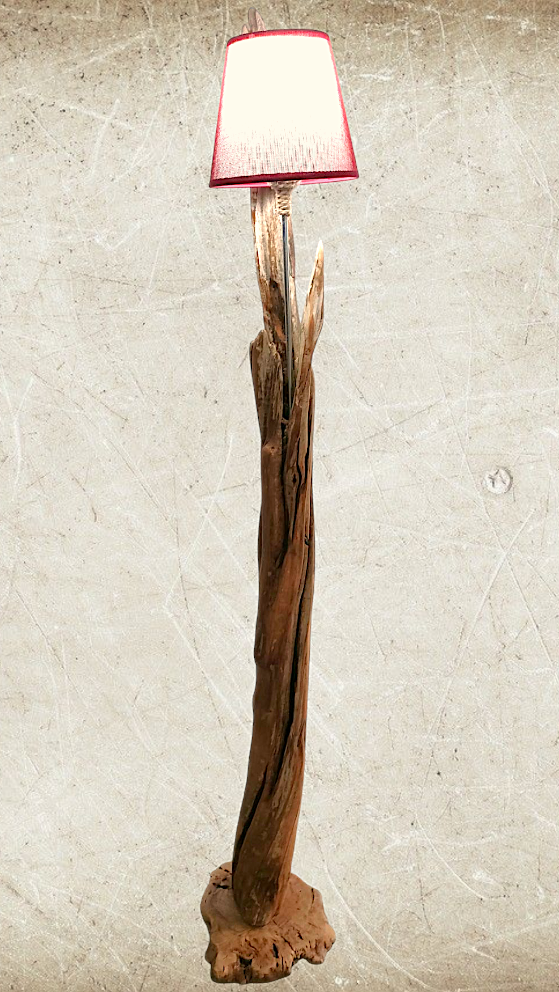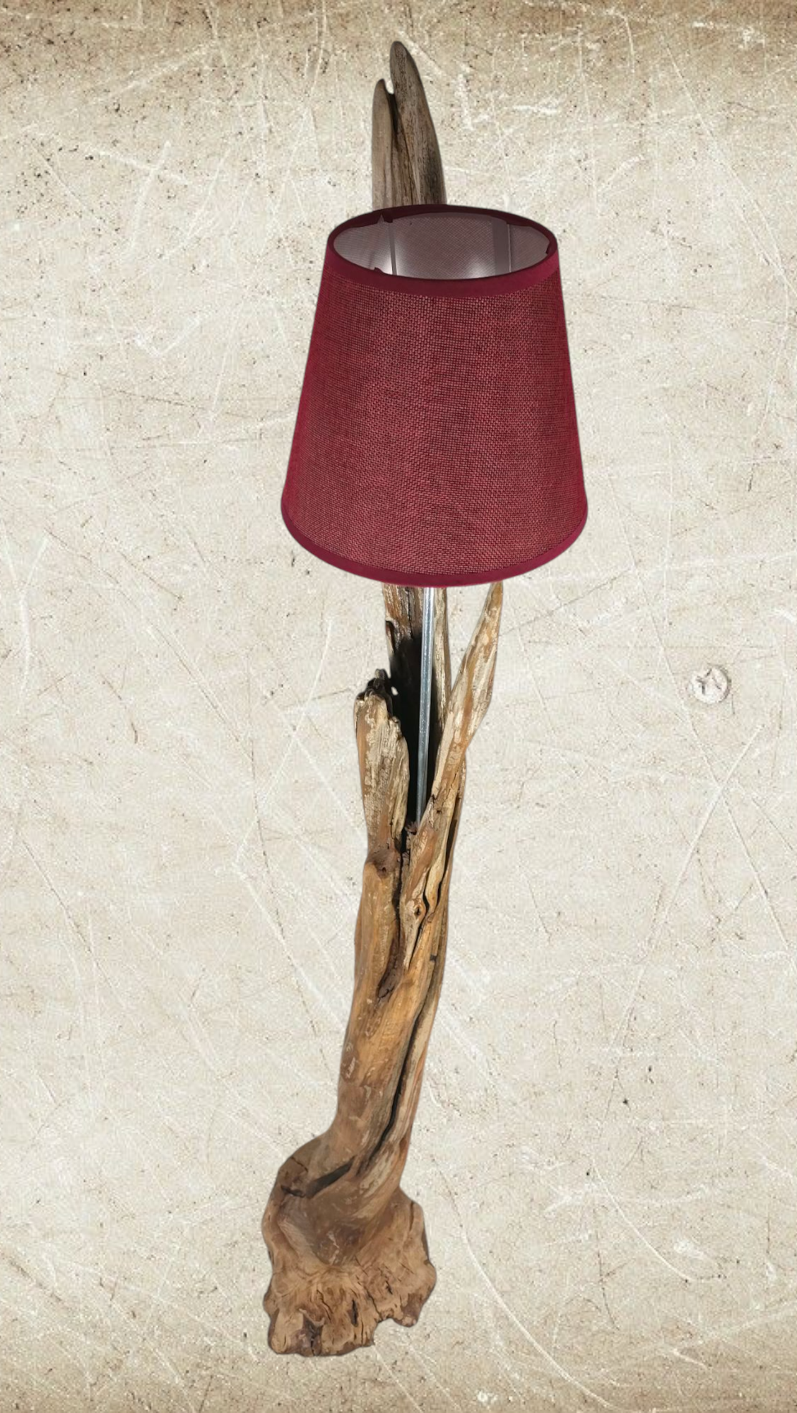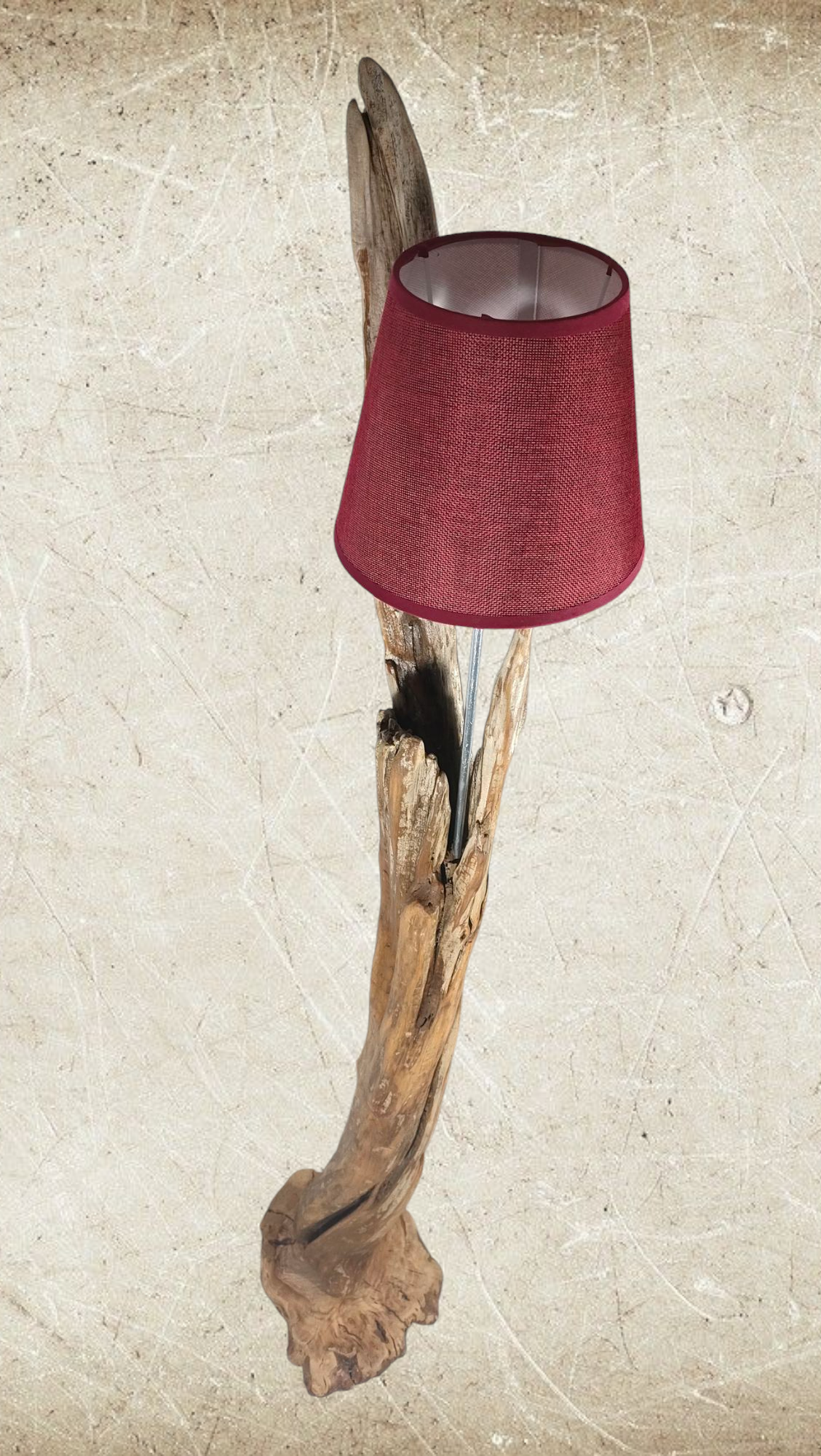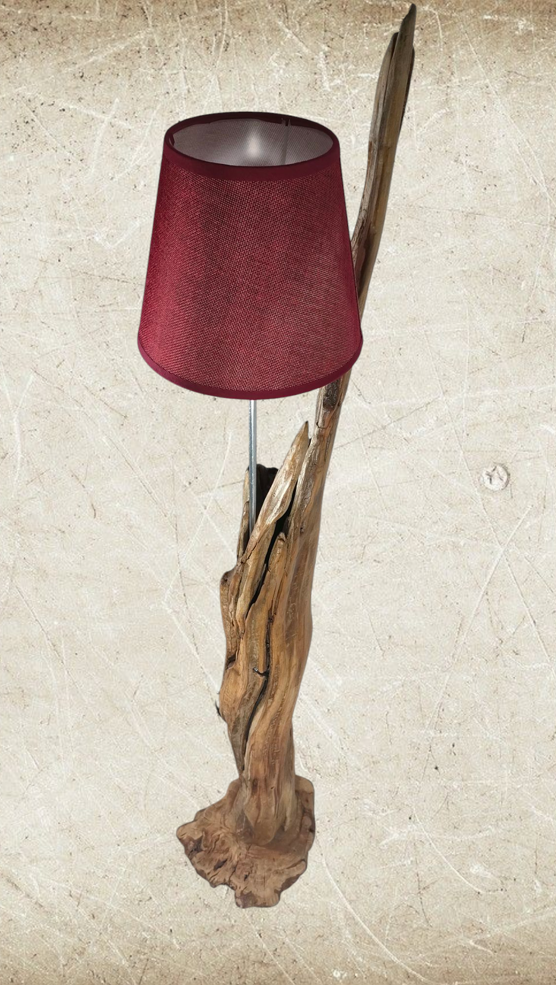 Cuenta con un punto de luz para bombillas E-27, soportado por una varilla de aluminio que esta insertada en la propia madera y casquillo forrado, parcialmente, en cuerda. Pantalla en color granate de 22cm