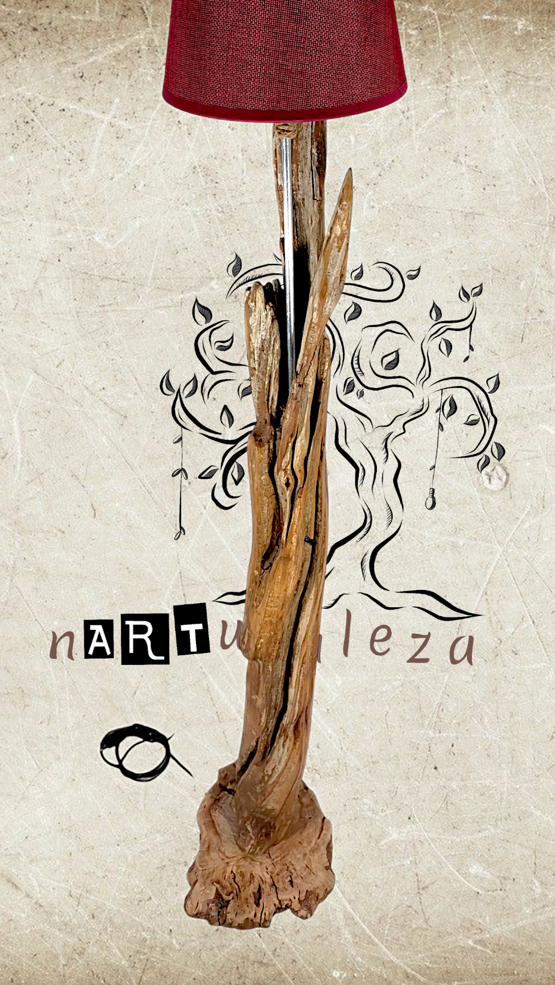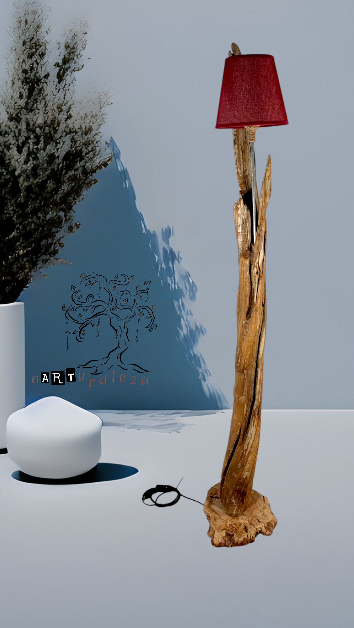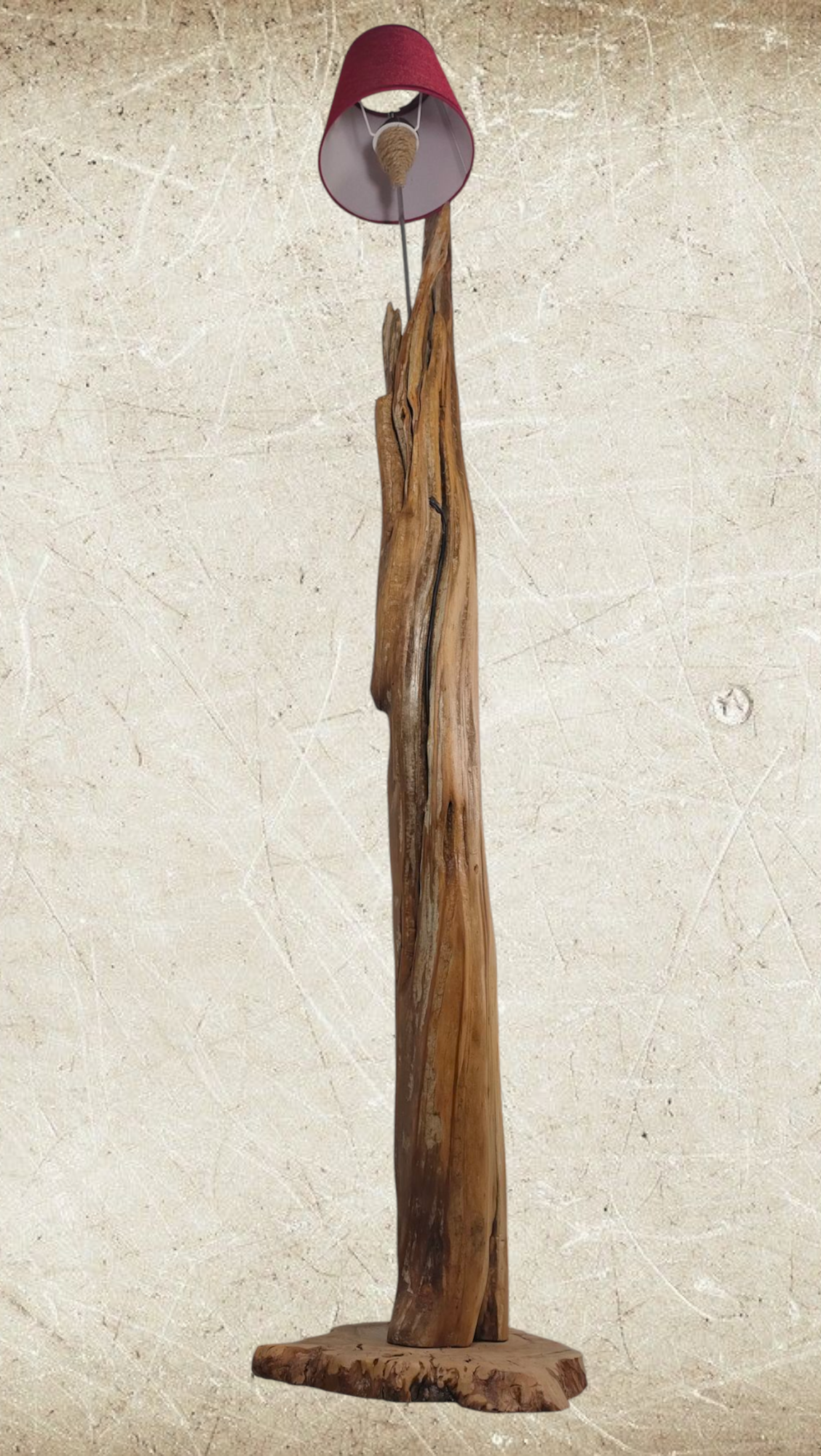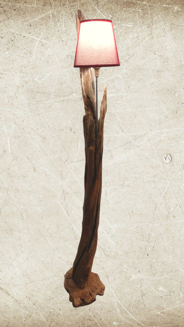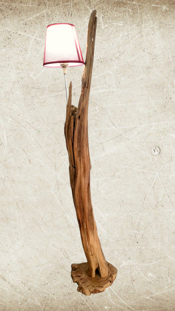 Lámpara de pie de 161cm de alto. Realizada de manera artesanal, a partir de un tronco de madera natural y base en madera de olivo.
