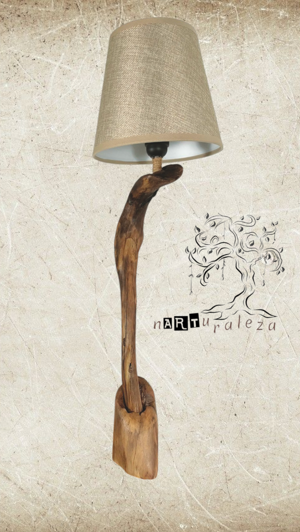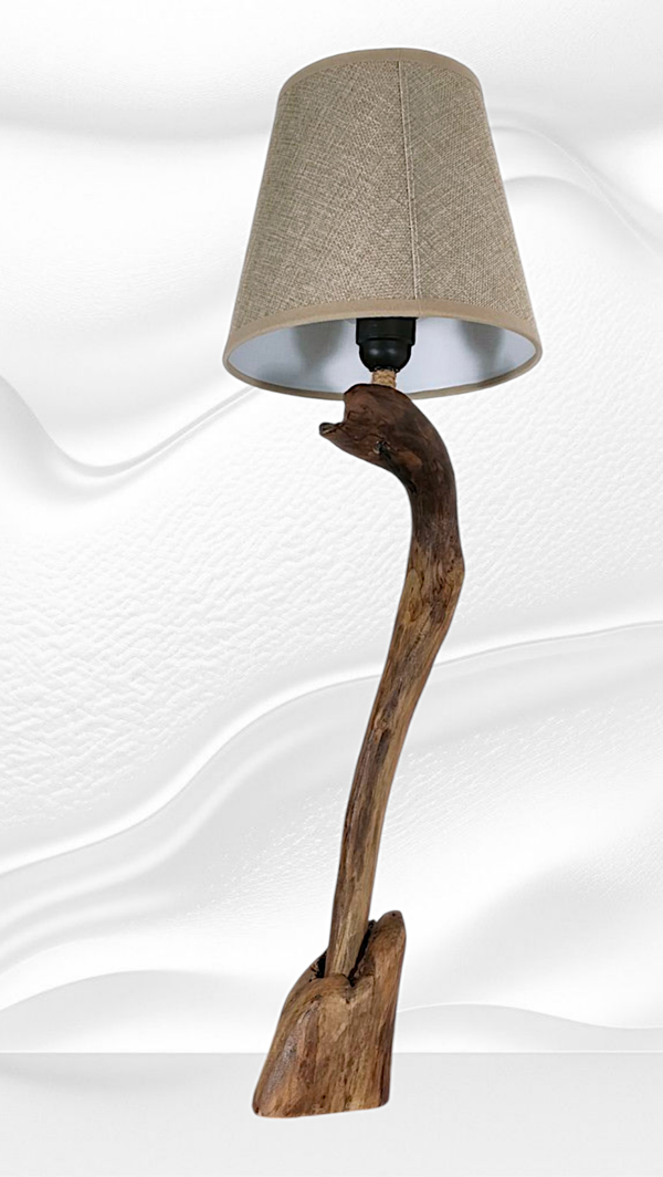 Lámpara de mesa de 65 cm de alto. Realizada artesanalmente a partir de dos fragmentos de madera unidos entre sí.